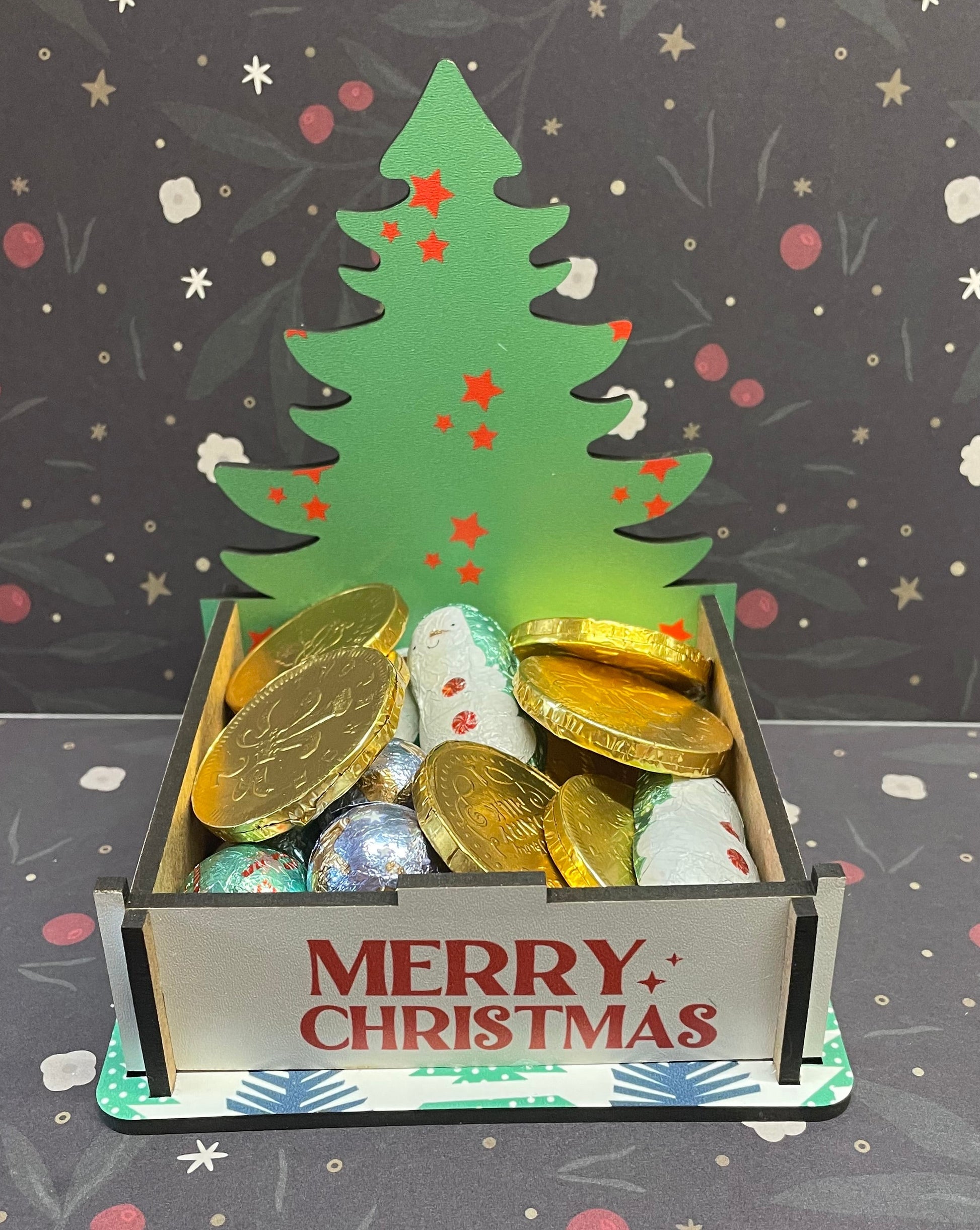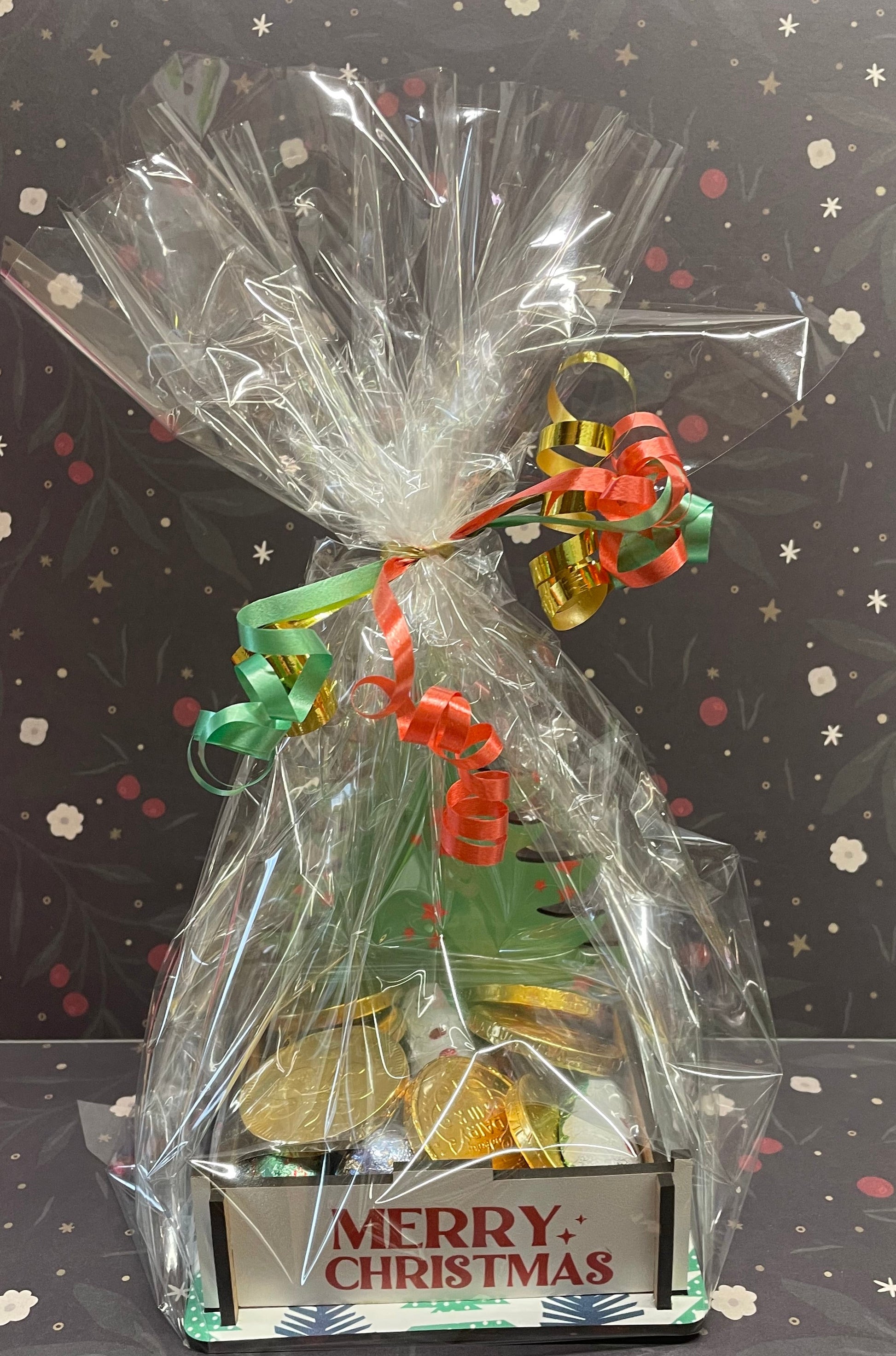 Measuring 10cm x 10cm x 10cm these mini crates are made of MDF and are hand built and decorated by me . Let me know via the.comment box what you would like on yours . It comes filled with 155g foiled festive chocolates and will also be wrapped with curling ribbon .