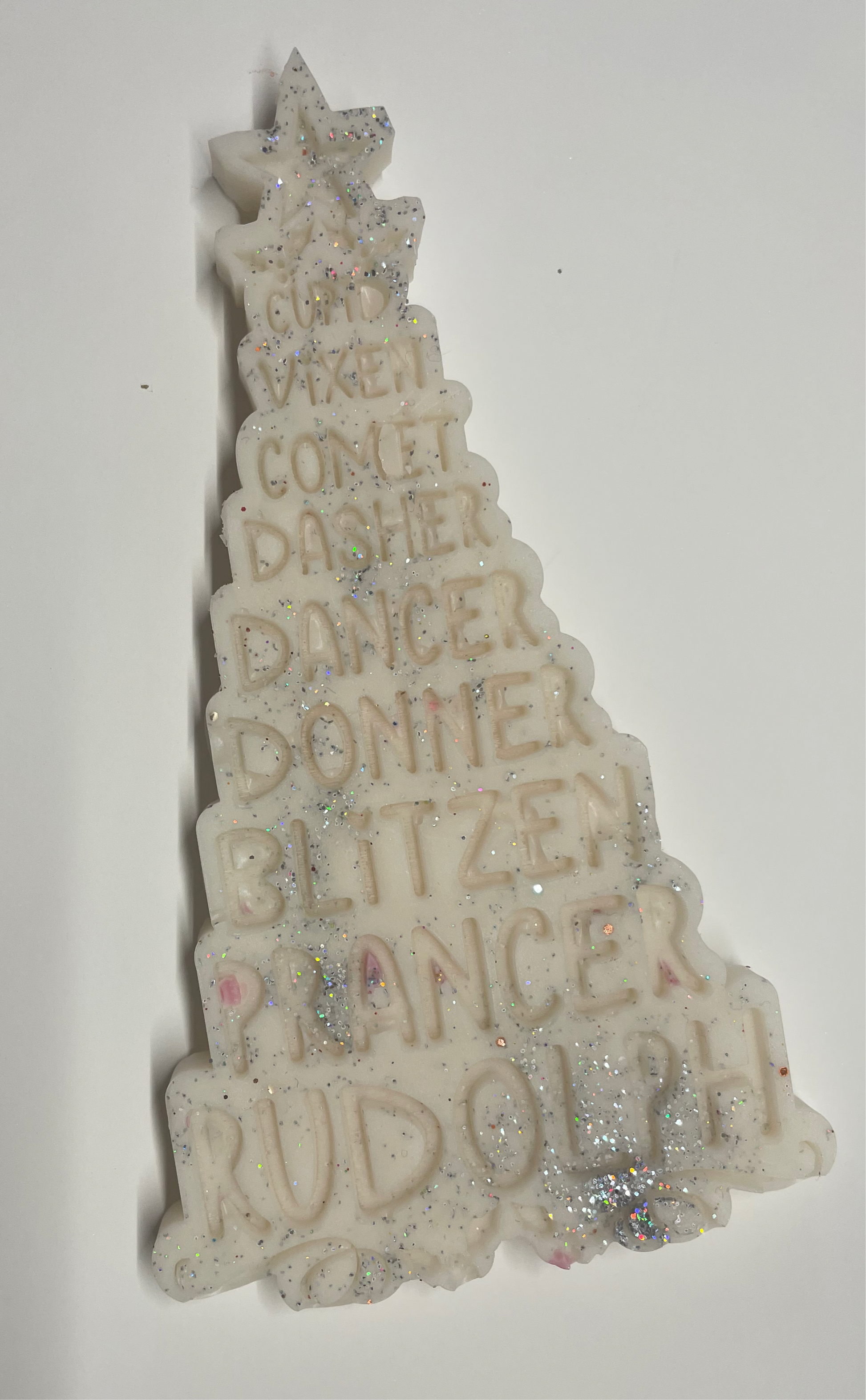 A beautiful wax bar shaped like a Christmas tree with all the reindeer names on . Weighing around 35g on average . Available in some of my festive scents .