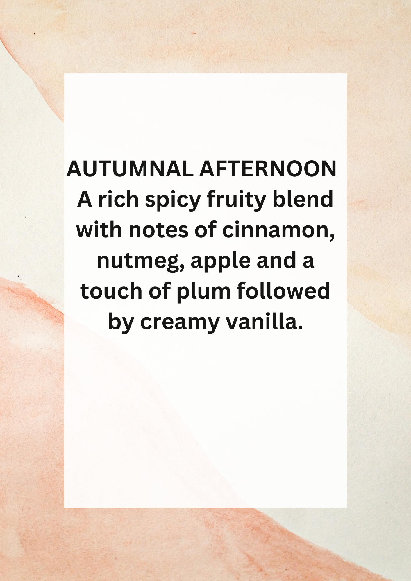 AUTUMNAL AFTERNOON A rich spicy fruity blend with notes of cinnamon, nutmeg, apple and a touch of plum followed by creamy vanilla.