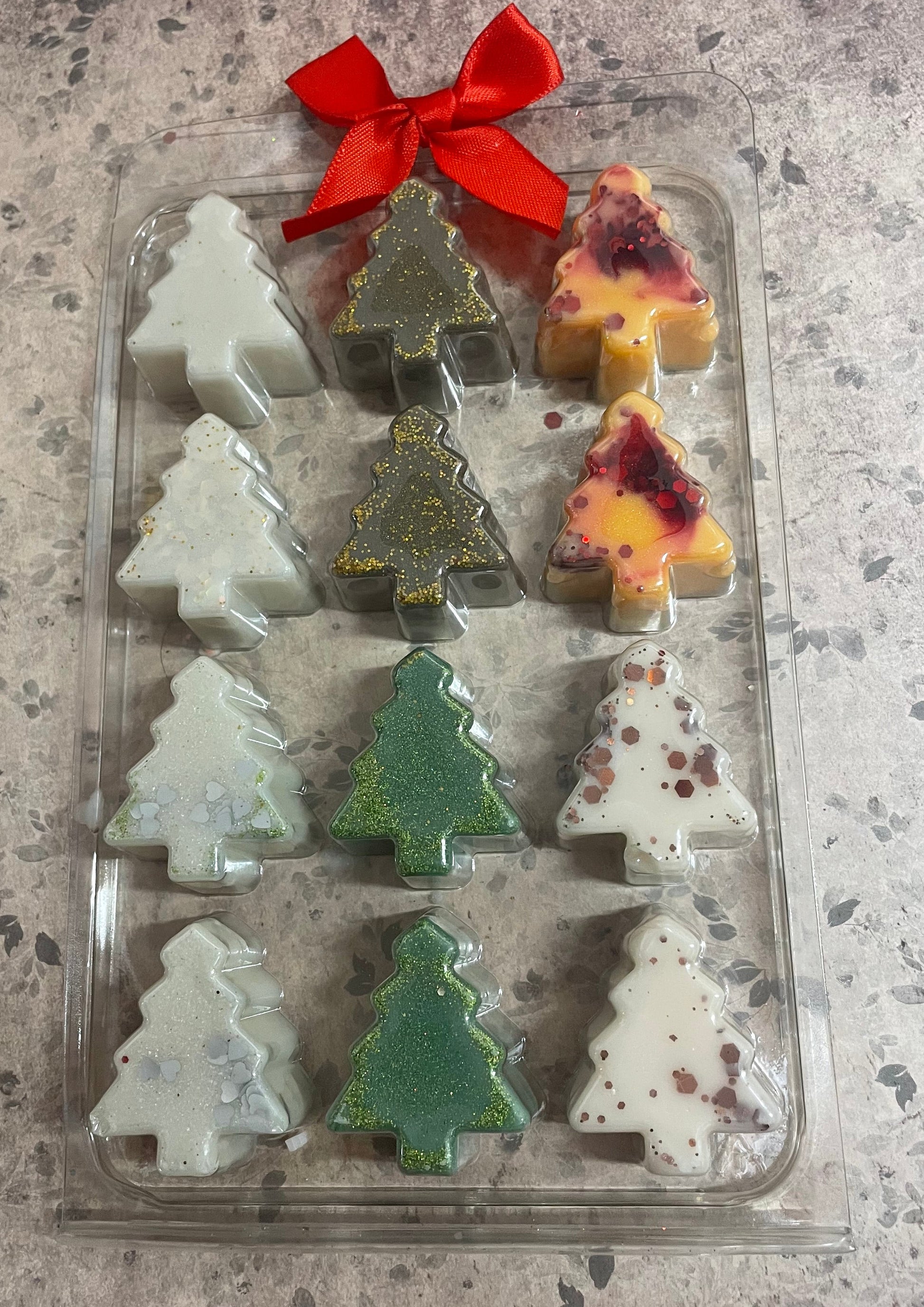 A beautiful recycled and recyclable clam shell with 12 tree shaped wax melts . 6 festive scents , 2 per scent .