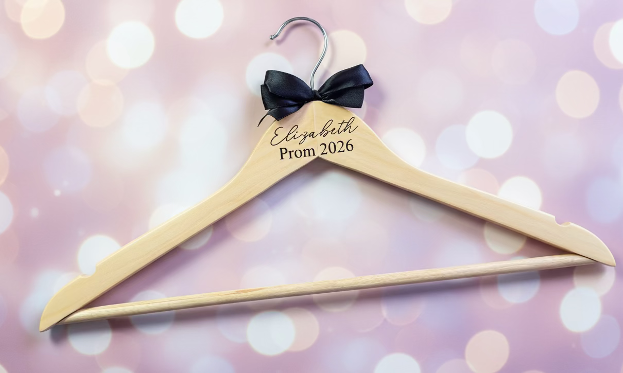 A wooden hanger with a name and prom 2026 attached and a bow